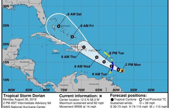 La directora de la Oficina Nacional de Meteorología (Onamet), Gloria Ceballos, informó que Dorian estará tocando el territorio nacional como huracán categoría uno el jueves en la mañana y que durante todo ese día se sentiría su presencia, generando importantes acumulados de lluvias.