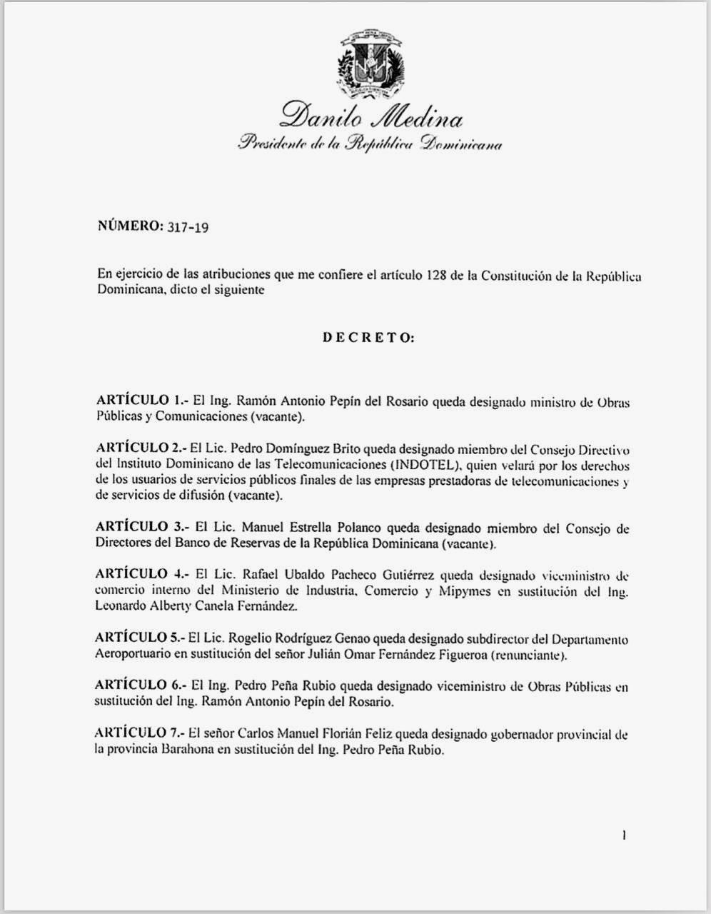 El mandatario también designó a Rafael Ubaldo Pacheco Gutiérrez, viceministro de Industria y Comercio y Mipymes en sustitución de Leonardo Alberty Canela Fernández; Rogelio Rodríguez Genao, subdirector del Departamento Aeroportuario en sustitución de Julián Fernández Figueroa; Pedro Peña Rubio, viceministro de Obras Públicas, en sustitución de Ramón Antonio Pepín, Carlos Manuel Florián Féliz, gobernador provincial de Barahona, en sustitución de Pedro Peña Rubio.