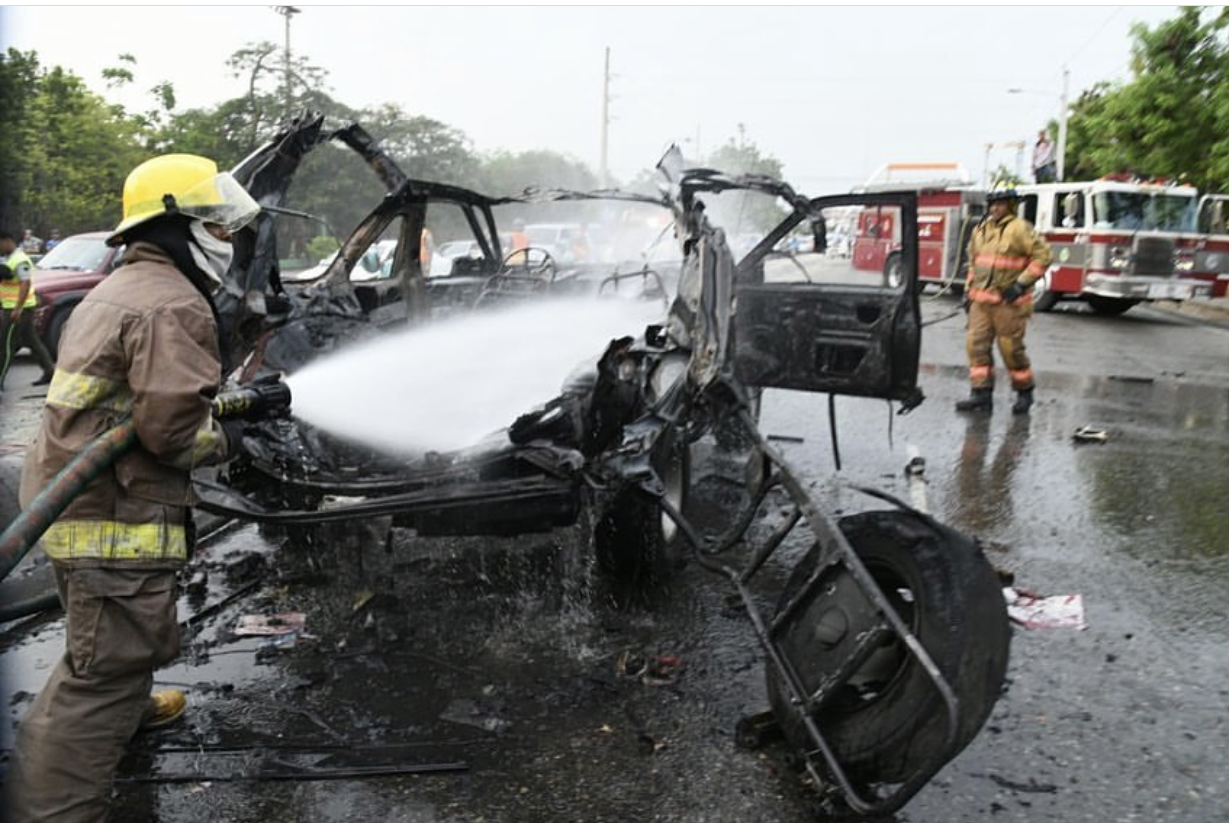 Burgos en declaraciones a reporteros del Listín Diario informó que el incidente se produjo por un cortocircuito que ocasionó que el vehículo se llenara de humo y que cuando revisó el tablero se percató de una llama de fuego que tenía este.